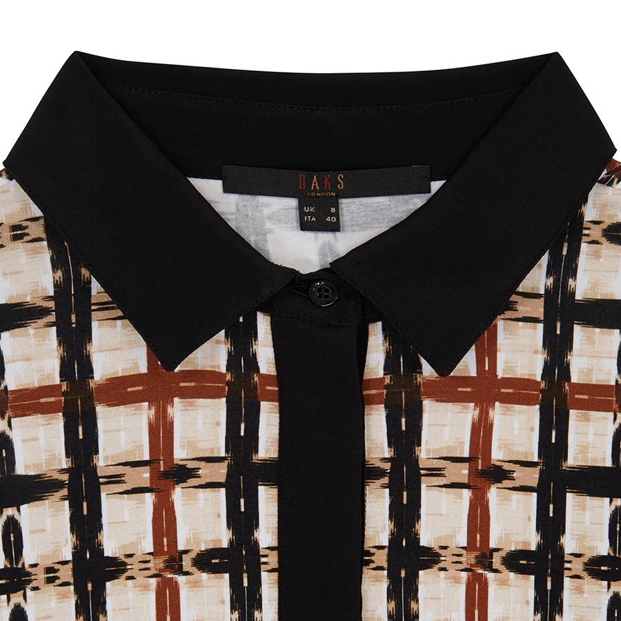 The Sadie blouse in a transfigured House Check print, features a contrasting black collar and hidden button detail with short sleeves.