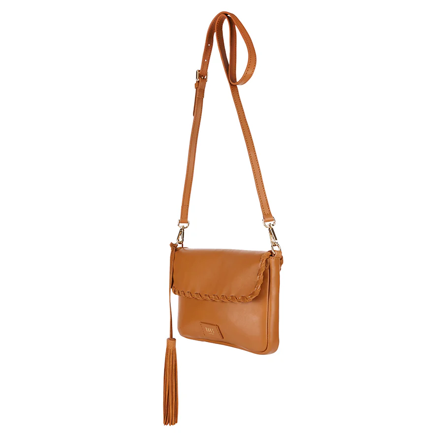 The Maisie leather cross body bag features a braided detail and tassel in suede. It is a fold over style, with a zip pocket compartment, the perfect size for personal essentials.